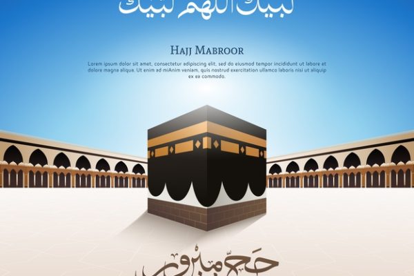 Islamic pilgrimage with arabic text and islamic ornaments Free Vector