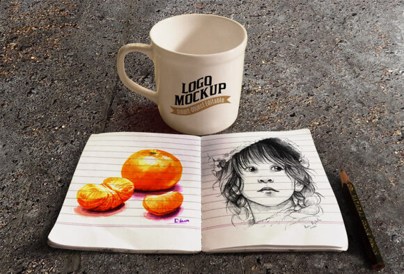 Completely layered PSD file showing a coffee cup and sketchbook. Change the background, the cup label and book content via smart objects.