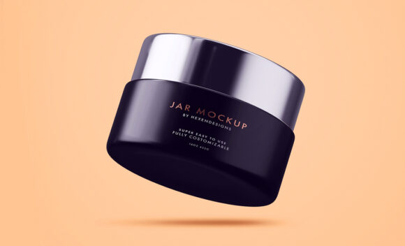 A free sample mockup (full version) of floating cosmetic jar. Print-ready PSD file (4000 x 3000 px at 300 dpi) with effect and smart layers.