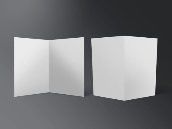 A collection of three prespective mockups of a half-fold flyer. The dimensions are 4000 x 3000 px at 300 dpi (smart object included).