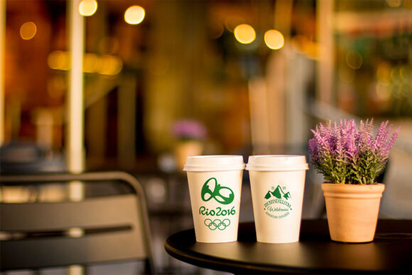Photo-realistic mockup showing two cups on a Café table: The PSD’s dimensions are 3500 x 2500 px.
